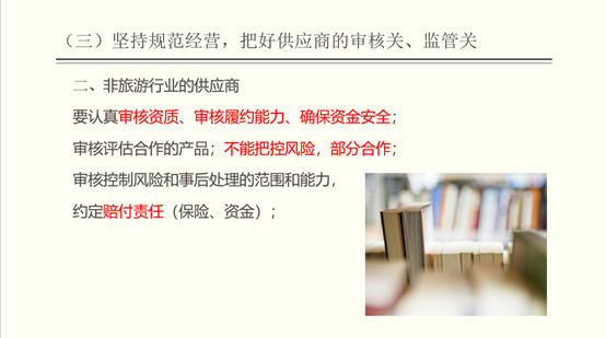 会上,王老师采用“以案为例”方式,从文旅消费模式重构,消费者和供应商的变化,把好供应商的审核与监管关,把好产品关、合同签署关等方面展开,用通俗易懂的语言,深入浅出地讲授了旅游产品销售经营过程中风险防范、合同签订、投诉处理等的工作方法和技巧。